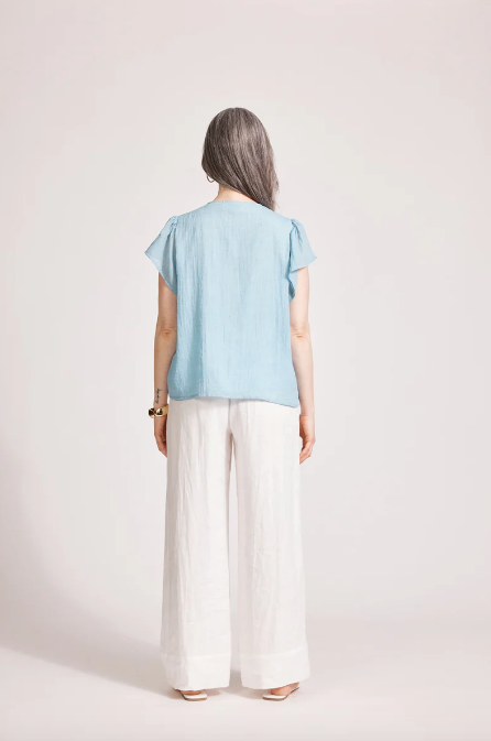 A breathable, cotton-blend blouse with thoughtful detailing. Light and textured fabric with a double-layered construction for modesty. Features a button-through front, relaxed fit, and pleated panels at the shoulder.