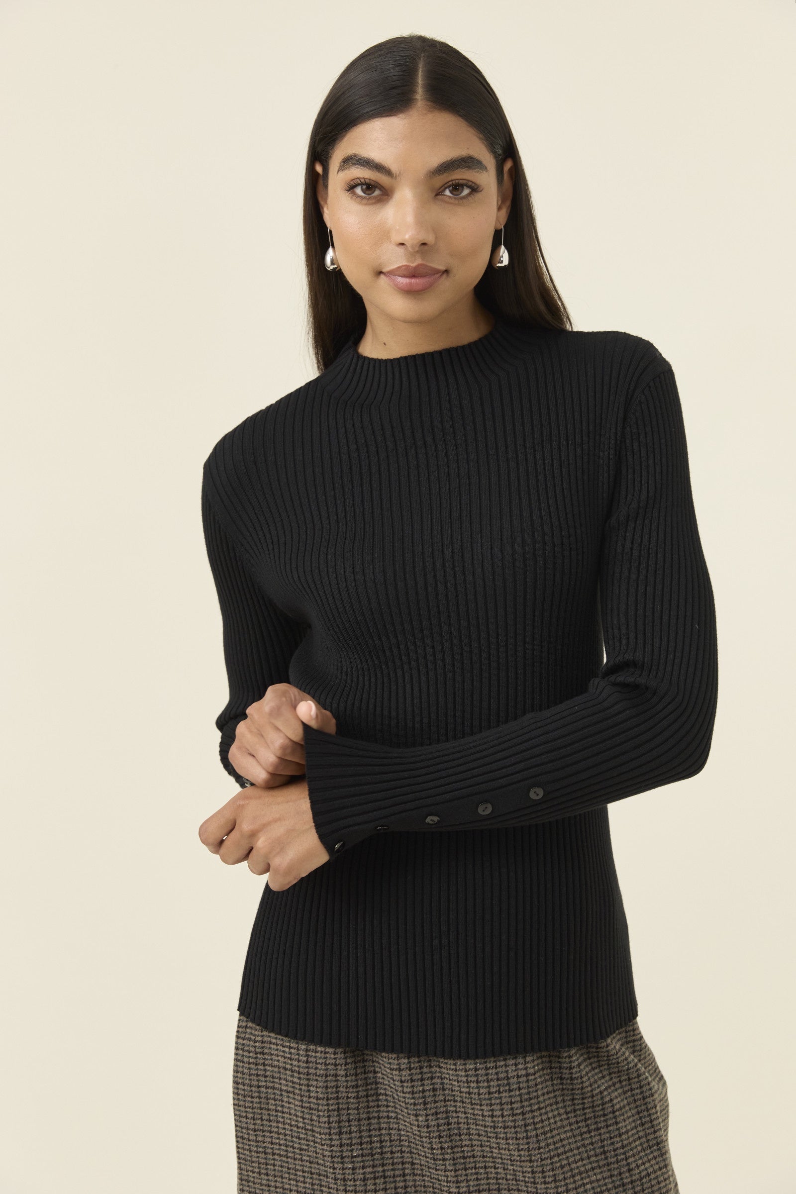 A fitted rib knit top designed with clean lines and a soft, stretchy feel. The small funnel neckline adds a refined touch, while the sleeve buttons bring subtle detailing to the minimalist shape.