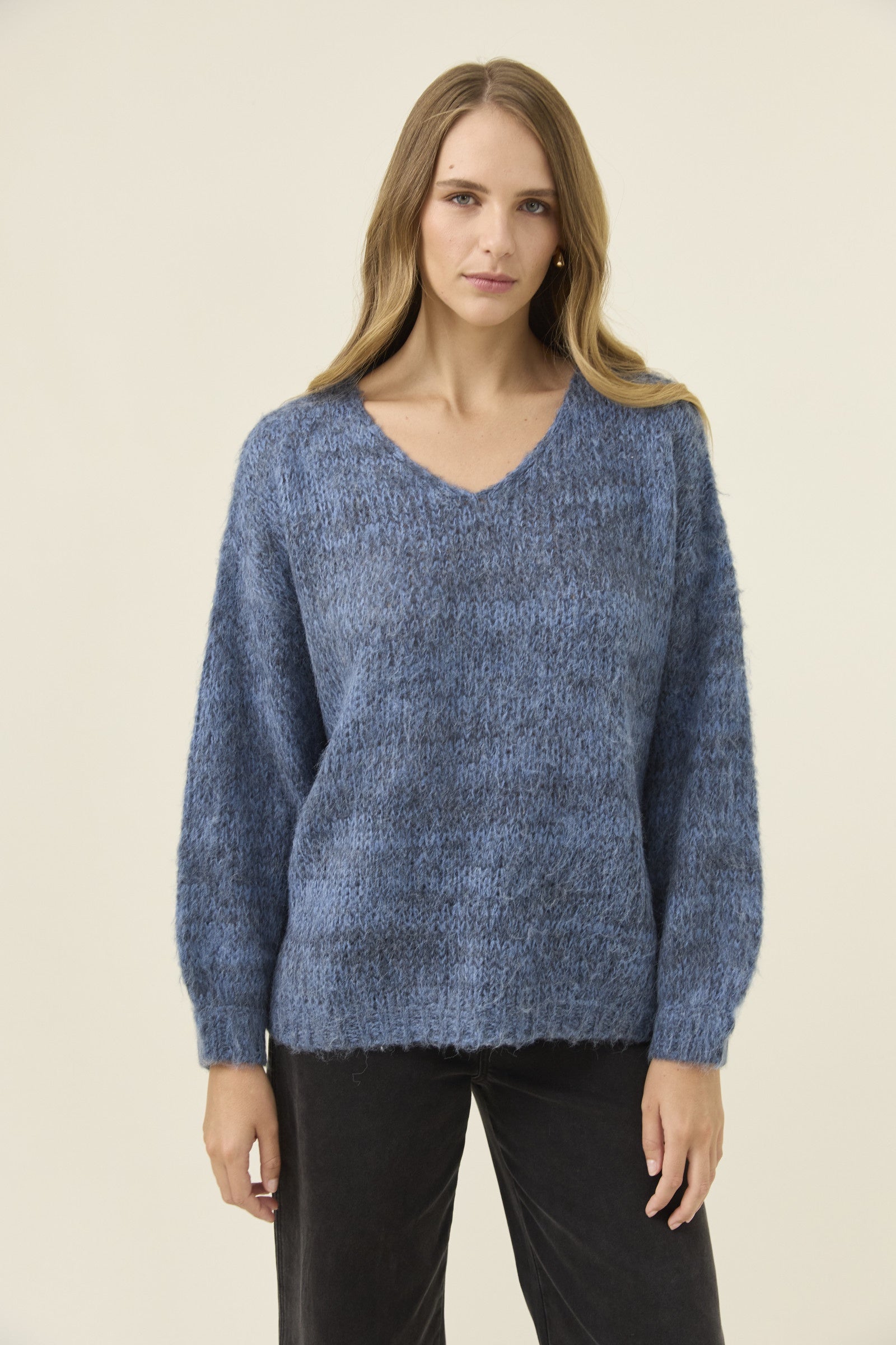 A soft V-neck knit with a gentle, mixed two-tone effect that feels light and airy for cool days. The fluffy, loose knit texture gives it a relaxed, cosy touch while keeping the silhouette simple and easy to layer.