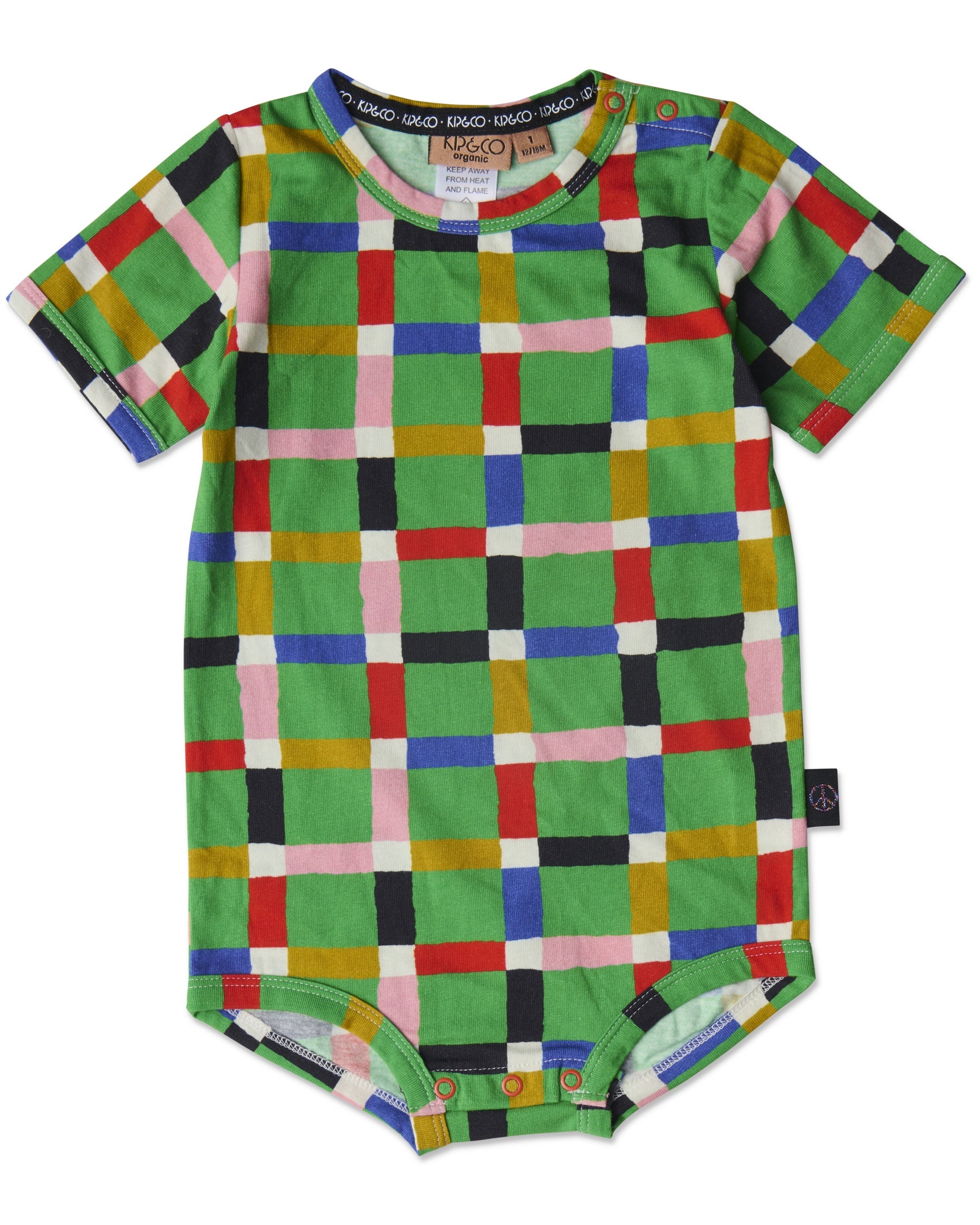 Kip&Co's Jolly Tartan Organic Short Sleeve Romper! Made from breathable, ultra-comfy organic cotton jersey this romper is soft, practical, and full of joy - the perfect attire for active little elves this summer silly season. Featuring a playful tartan pattern in a mix of colours on a bold green base.