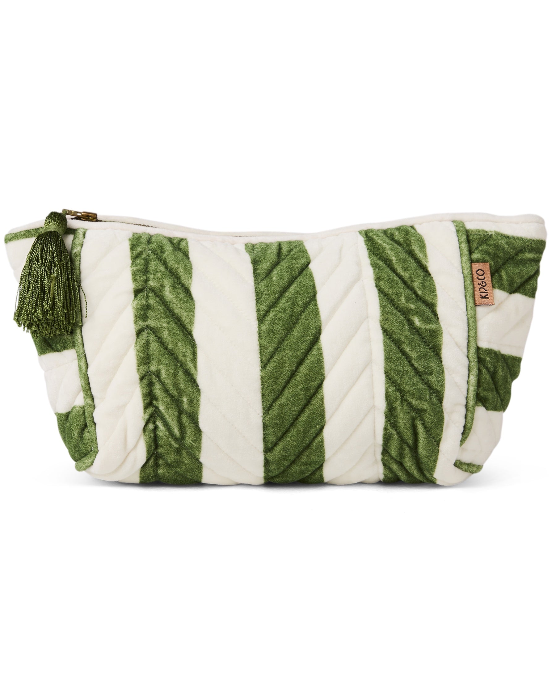 Kip&Co's beauty bag everyone loves. Their best-selling quilted velvet toiletry bag is back to carry your everyday bits in cushy, velvety style. Soft to touch, bold to behold, and roomy enough for your daily must-haves, this bag is proof that practical can also be seriously pretty. The Moss Stripe Velvet Toiletry Bag features a moss green and creamy white stripe velvet with green tassel zip.