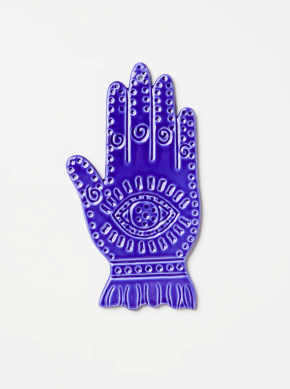 The Indigo Hand Talisman merges protective symbolism with contemporary craft through rich cobalt-glazed bone china. Each piece is debossed by hand with ancient markings, the watchful eye centred in the palm surrounded by intricate patterns that speak to traditions of spiritual safeguarding. This deep blue guardian creates striking visual impact when paired with other wall art in thoughtful groupings, while its glossy finish adds dimensional depth to small niche walls and intimate spaces.